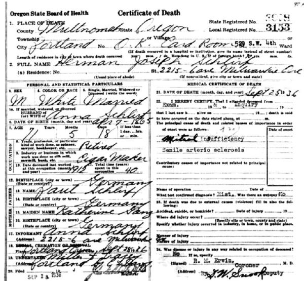 Anna C. Helmkamp were married on April 11, 1894 in Macoupin, Illinois, USA. He died on September 25, 1936, at age 71, in Portland, Multnomah, Oregon, USA. He was buried in Wilhelm's Portland Memorial Mausoleum, Portland, Oregon.