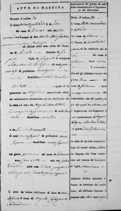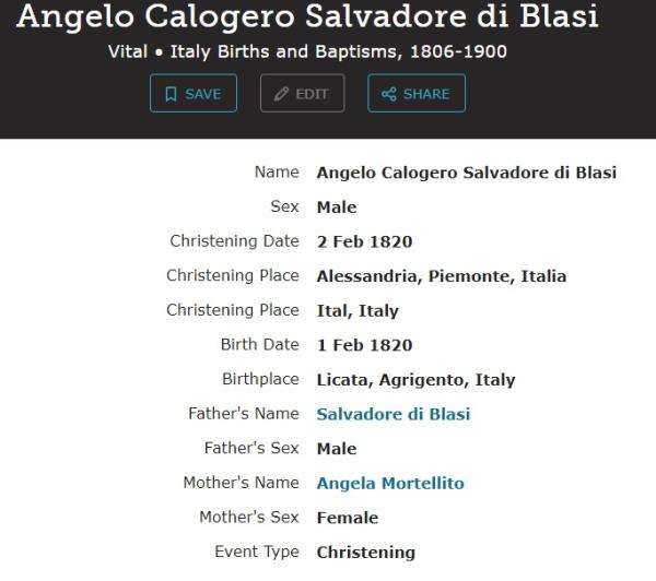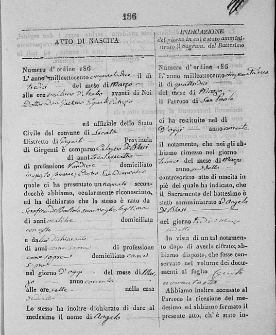 Angelo Calogero Salvadore Di Blasi was born on February 1, 1820 in Licata, Agrigento, Sicily, Italy. He and