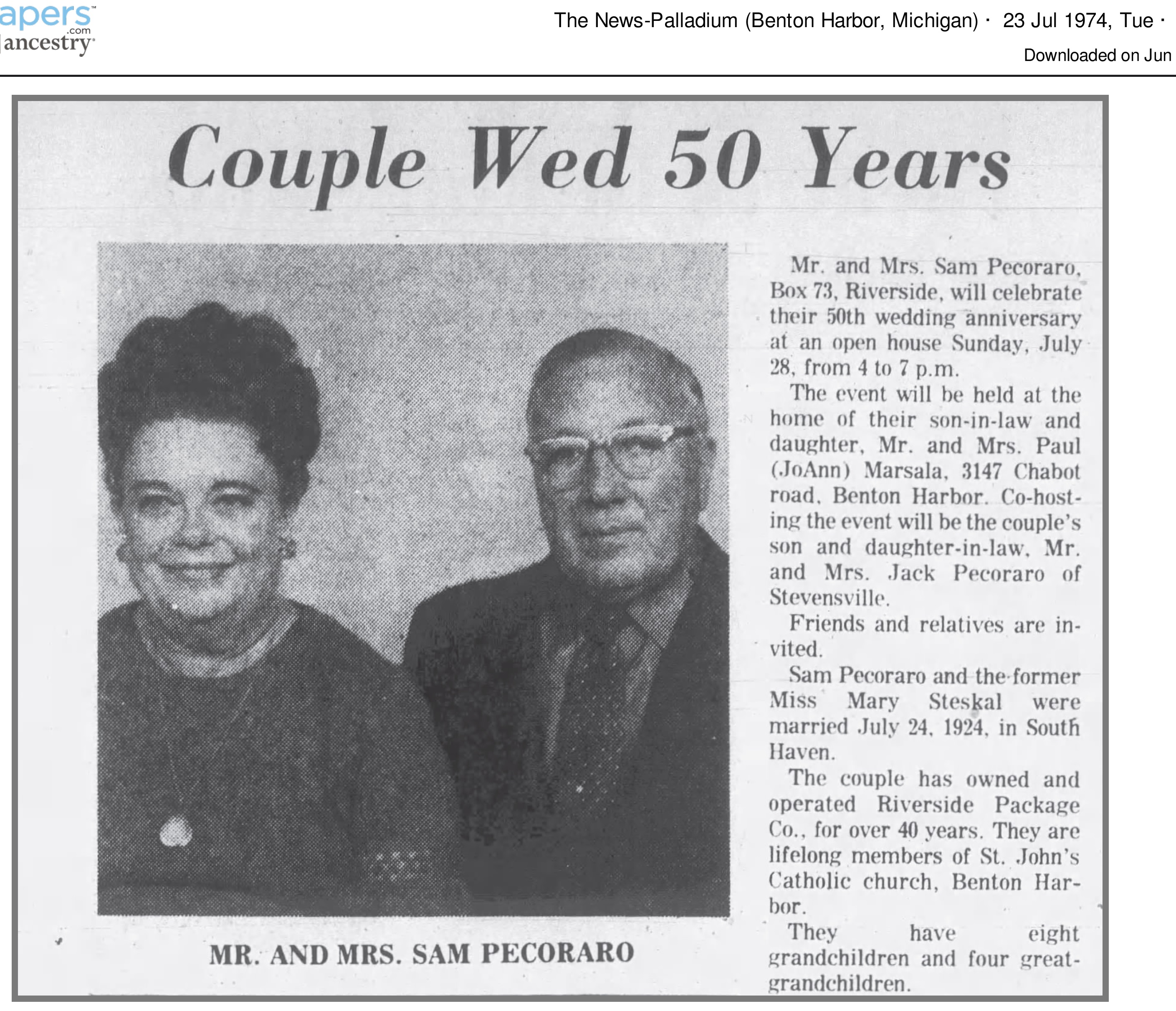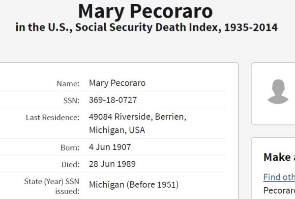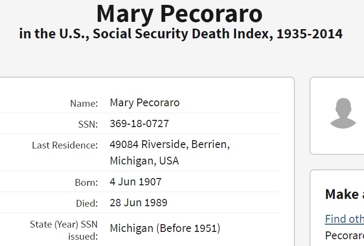 Samuel R. Pecoraro were married on August 18, 1924 in South Haven, Van Buren, Michigan, USA. She died on June 28, 1989, at age 82, in St. Joseph, Berrien, Michigan, USA. She was buried in North Shore Memory Gardens, Coloma, Michigan.