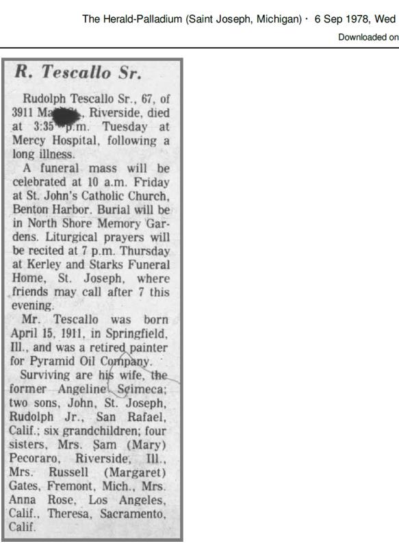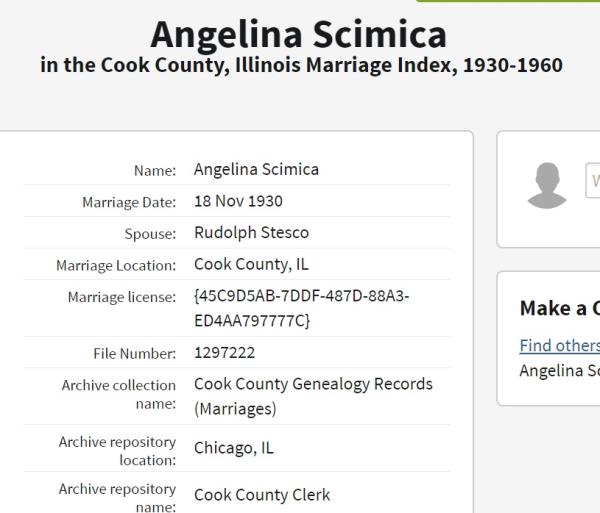 Angelina Scimeca were married on November 18, 1930 in Chicago, Cook, Illinois, USA. He died on September 5, 1978, at age 67, in Benton Harbor, Berrien, Michigan, USA. He was buried in North Shore Memory Gardens, Coloma, Michigan.