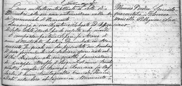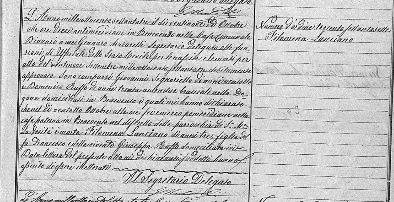Filomena Concetta Pellegrina Lanciano was born on December 6, 1870 in Benevento, Benevento, Campania, Italy. She died on October 28, 1873, at age 2, in Benevento, Benevento, Campania, Italy.