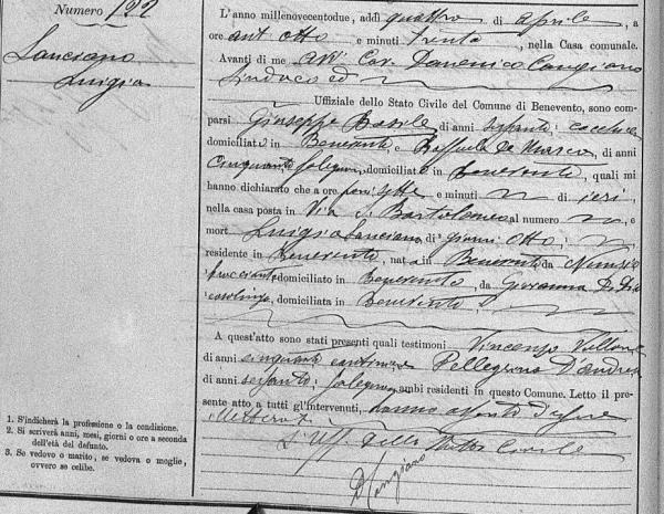 Luigia Lanciano was born in 1900 in Benevento, Benevento, Campania, Italy. She died on June 30, 1901, at age ~1, in Benevento, Benevento, Campania, Italy.