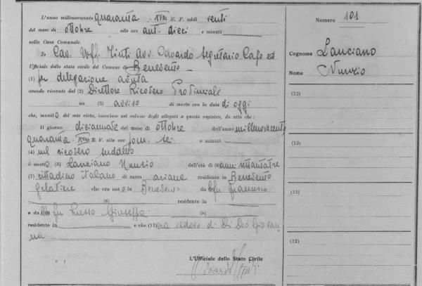 Nunzio Raffaele Orazio Lanciano were married on February 22, 1890 in Benevento, Benevento, Campania, Italy. She died on January 21, 1940, at age 75, in Benevento, Benevento, Campania, Italy.
