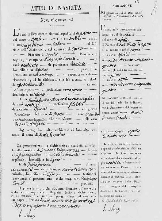 Maria Rosaria Corrado was born on March 31, 1854 in Ofena, L'Aquila, Abruzzo, Italy. She died on October 18, 1855, at age 1, in Ofena, L'Aquila, Abruzzo, Italy.