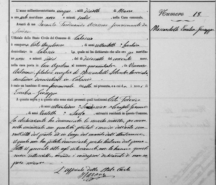 Emilia Giuseppa Moscardelli was born on March 17, 1885 in Calascio, L'Aquila, Abruzzo, Italy. She and