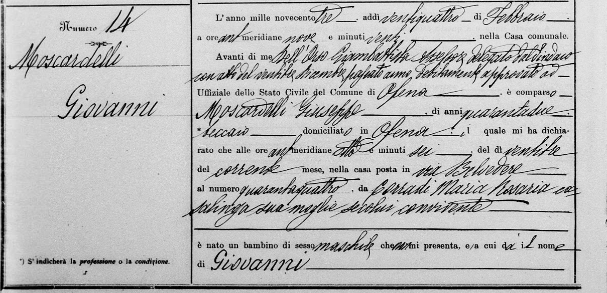 Giuseppe Nicola Moscardelli was born on May 17, 1921 in Ofena, L'Aquila, Abruzzo, Italy. He died on May 22, 1921, at age 0, in Ofena, L'Aquila, Abruzzo, Italy.