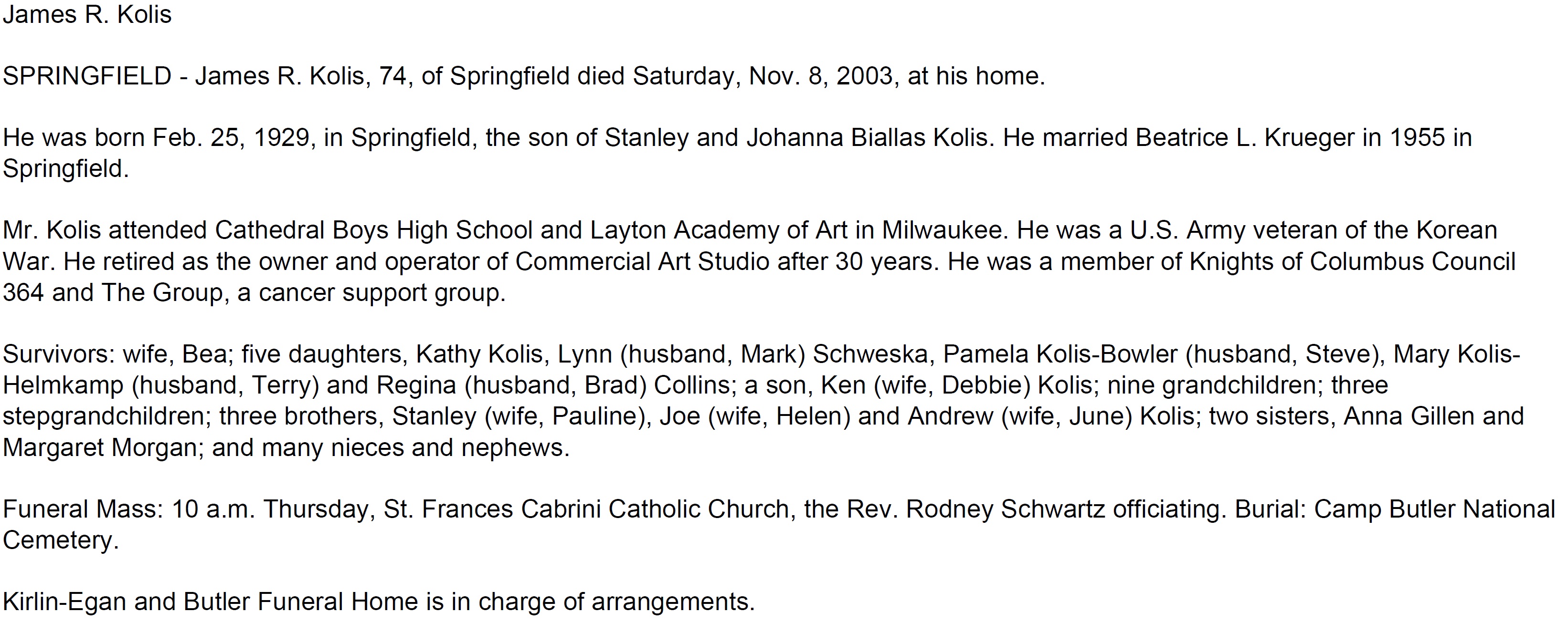 James R. Kollis was born on February 25, 1929 in Springfield, Sangamon, Illinois, USA. He and