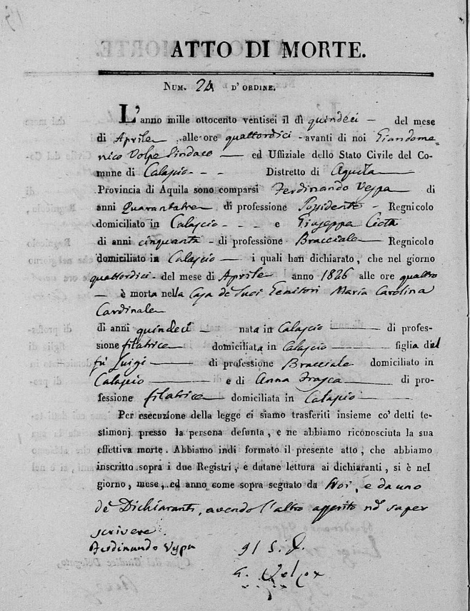Angelo Domenico Fulgenzi were married on October 28, 1810 in Calascio, L'Aquila, Abruzzo, Italy. She died.