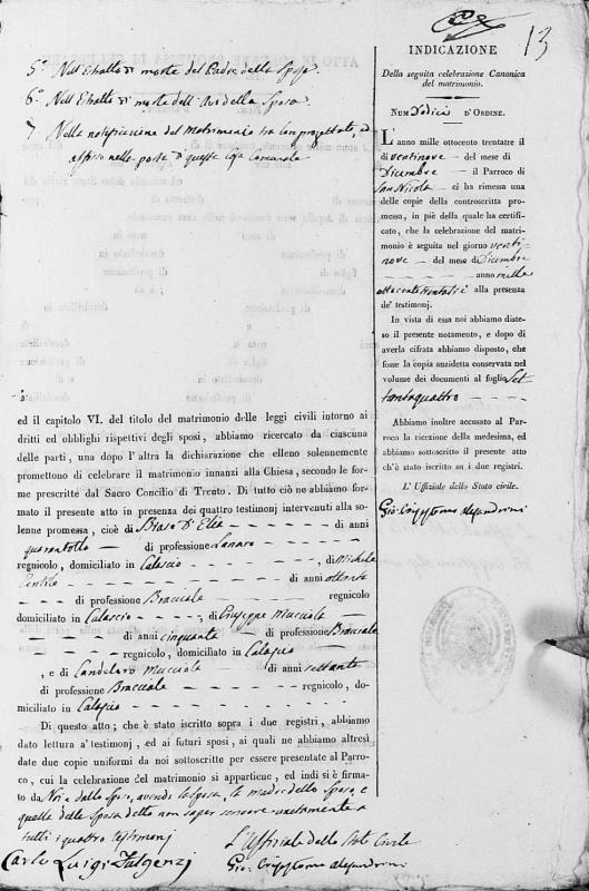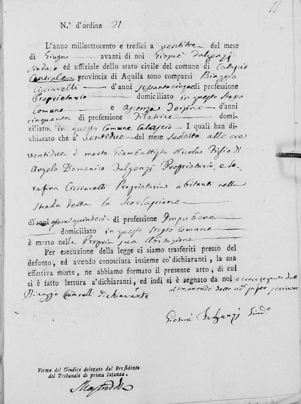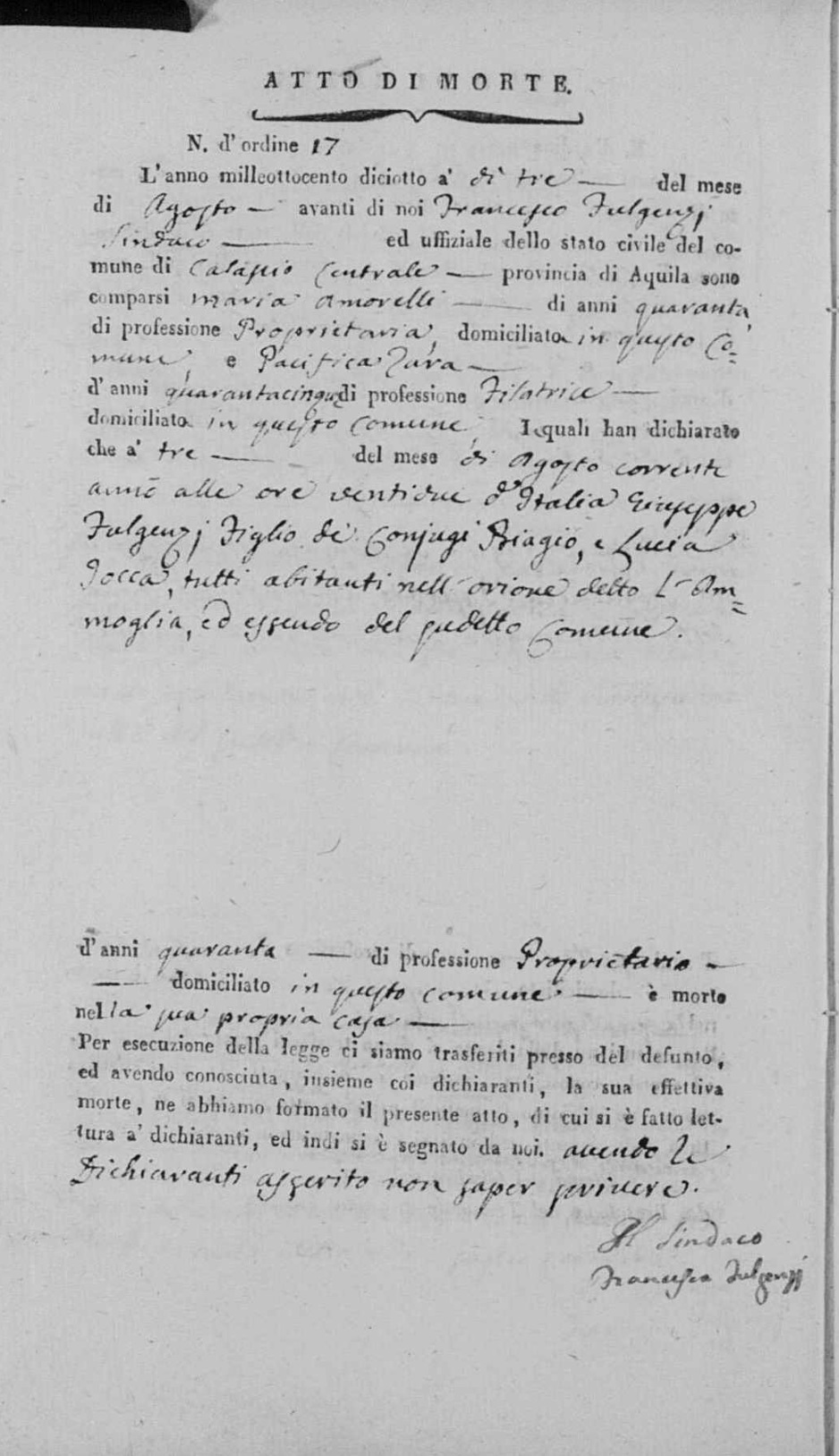 Giacinta Fulgenzi were married. He died on January 25, 1855, at age ~85, in Calascio, L'Aquila, Abruzzo, Italy.