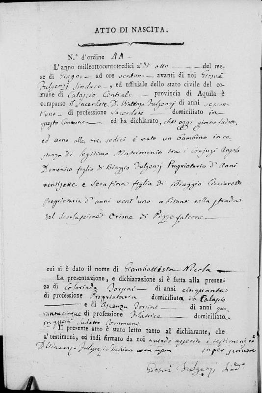 Angelo Nicola Fulgenzi was born on May 9, 1820 in Calascio, L'Aquila, Abruzzo, Italy. He and