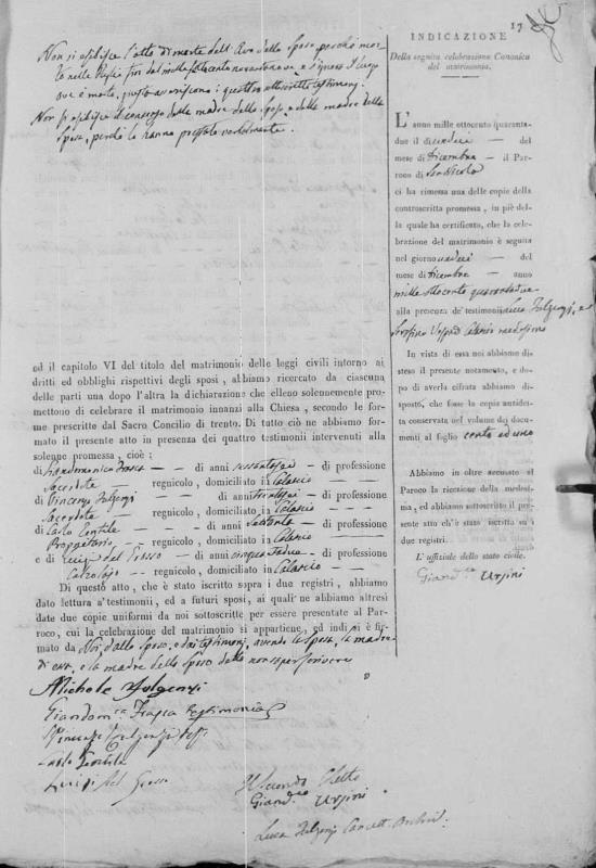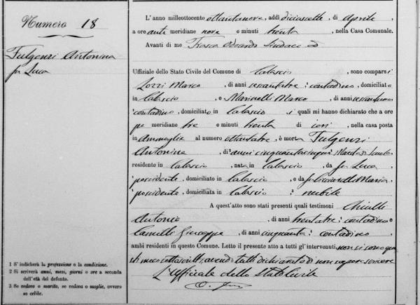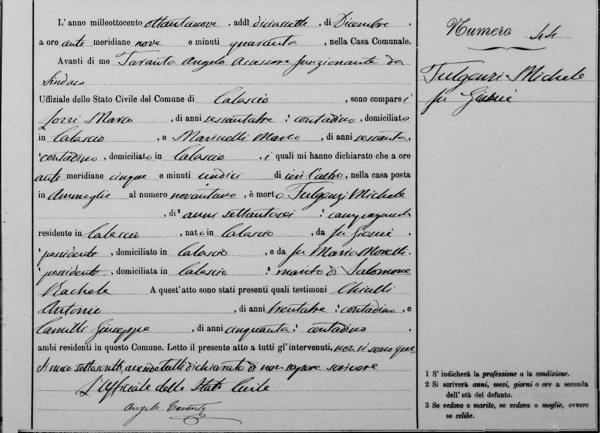 Maria Teresa Carolina Nunzia Fulgenzi were married on September 2, 1832 in Calascio, L'Aquila, Abruzzo, Italy. He died on January 12, 1883, at age ~78, in Calascio, L'Aquila, Abruzzo, Italy.