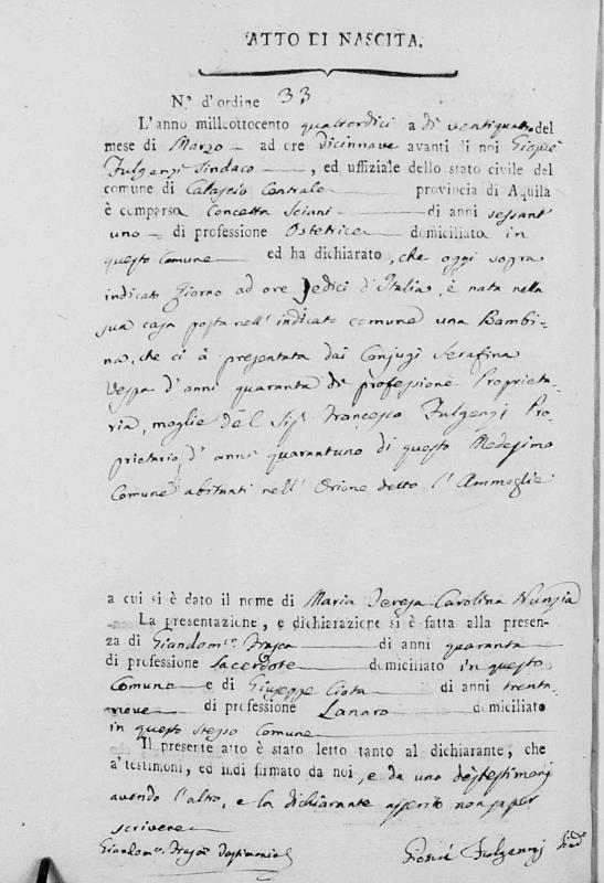 Maria Teresa Carolina Nunzia Fulgenzi was born on March 24, 1814 in Calascio, L'Aquila, Abruzzo, Italy. She and