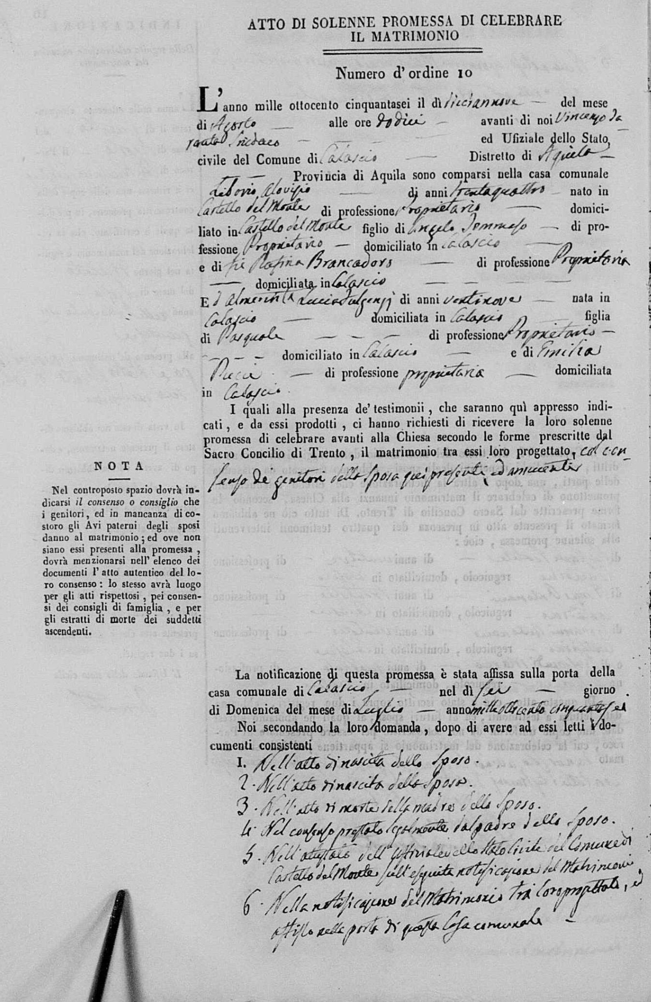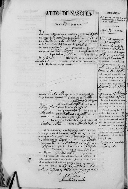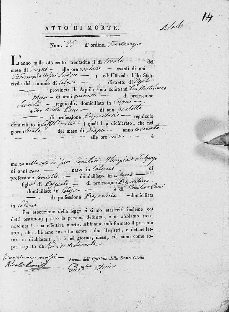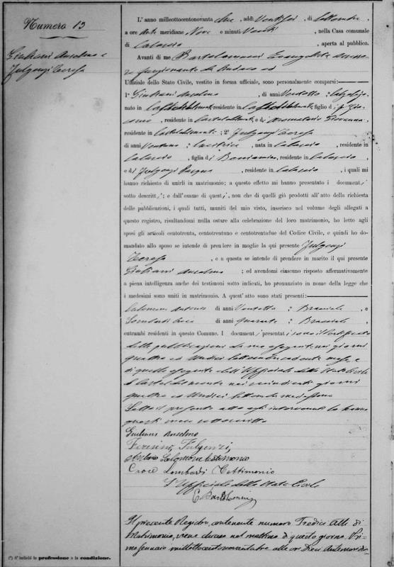 Almerinda Lucia Fulgenzi were married on August 19, 1856 in Calascio, L'Aquila, Abruzzo, Italy. He died.