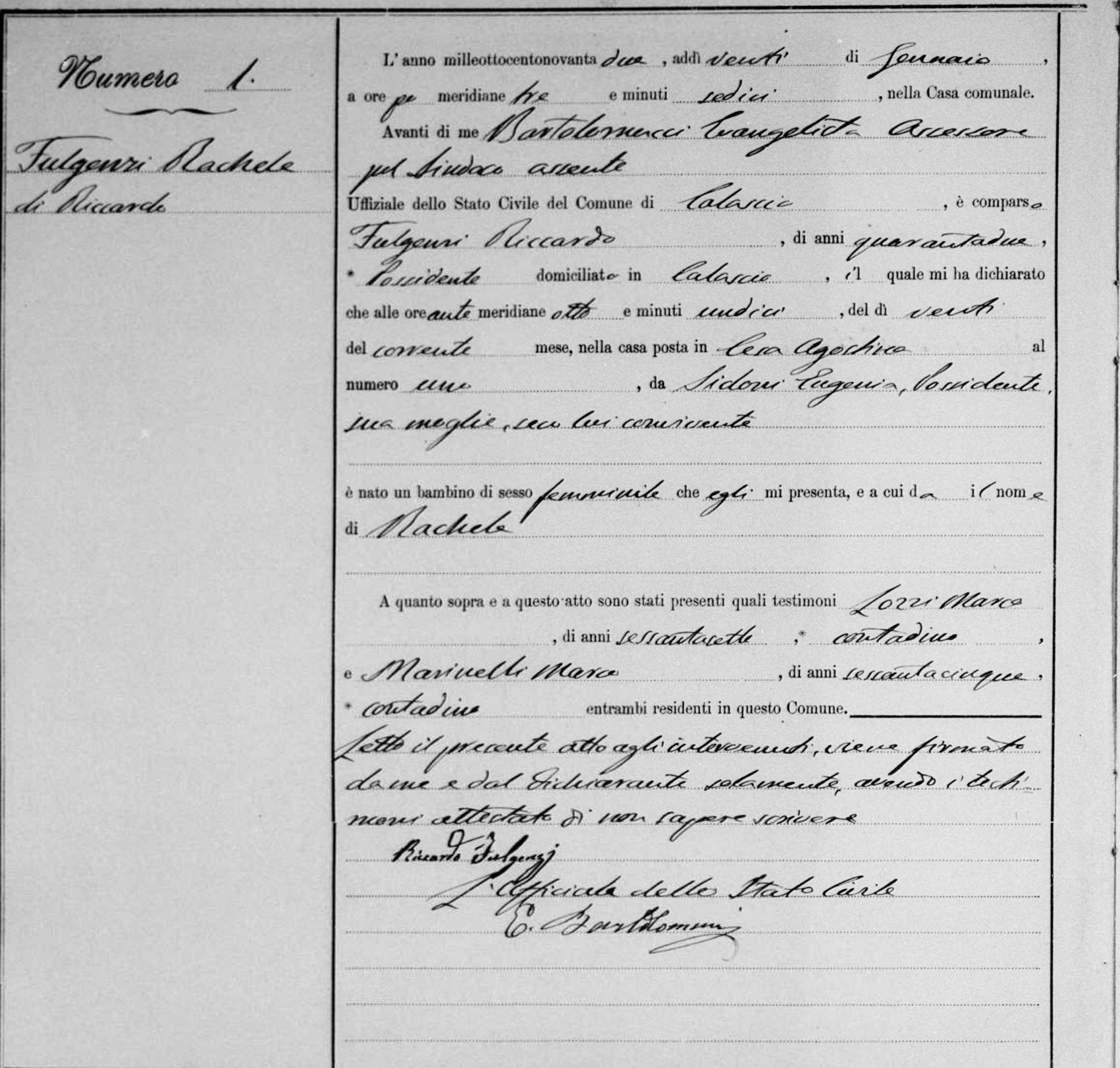 Rachel Fulgenzi was born on January 20, 1892 in Calascio, L'Aquila, Abruzzo, Italy. She died on January 21, 1892, at age 0, in Calascio, L'Aquila, Abruzzo, Italy.