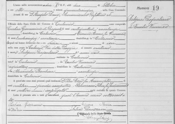 Pasquale Fulgenzi were married on April 18, 1915 in Calascio, L'Aquila, Abruzzo, Italy. She died.