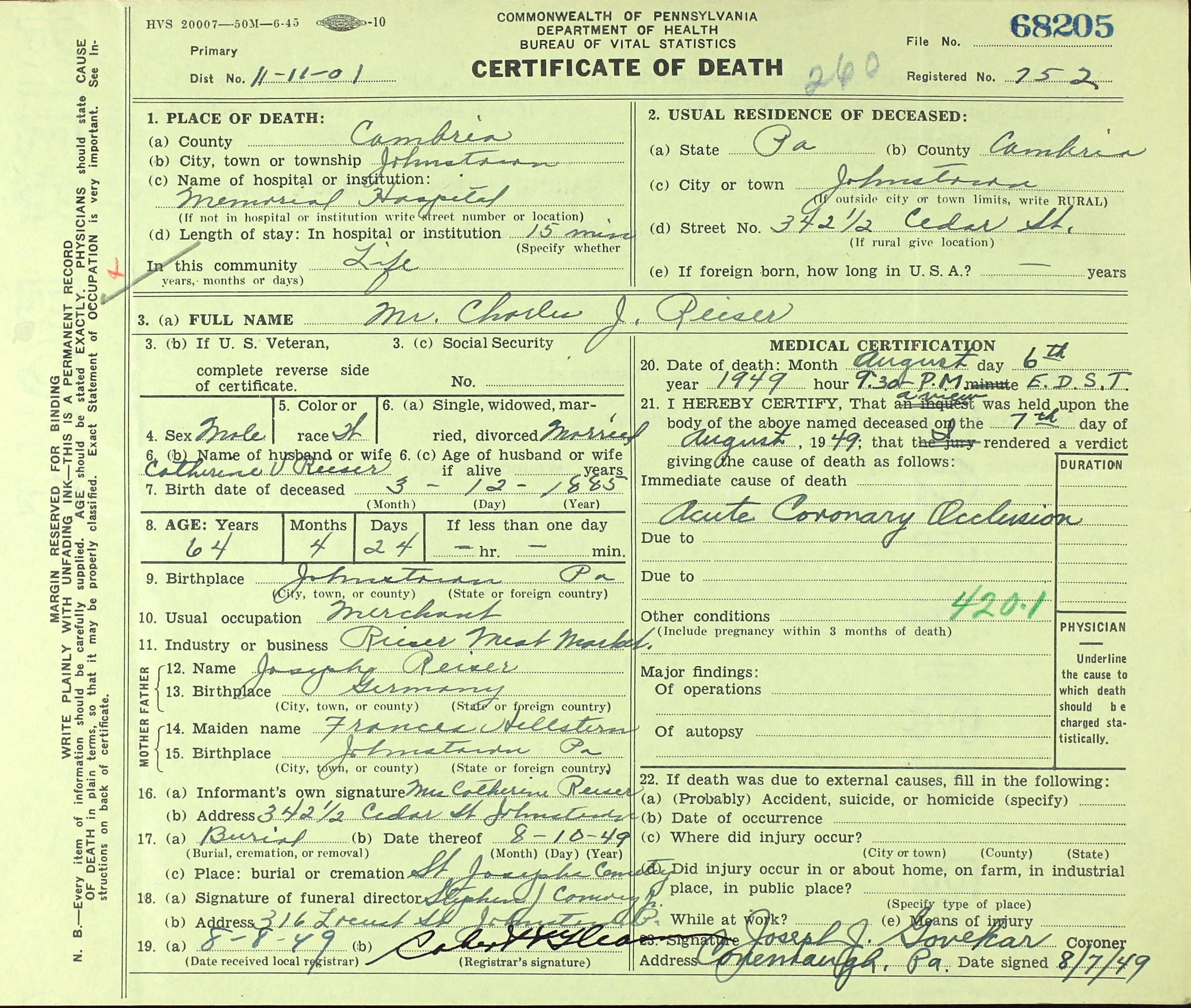 Charles Joseph Reiser was born on March 12, 1885 in Johnstown, Cambria, Pennsylvania, USA. He and