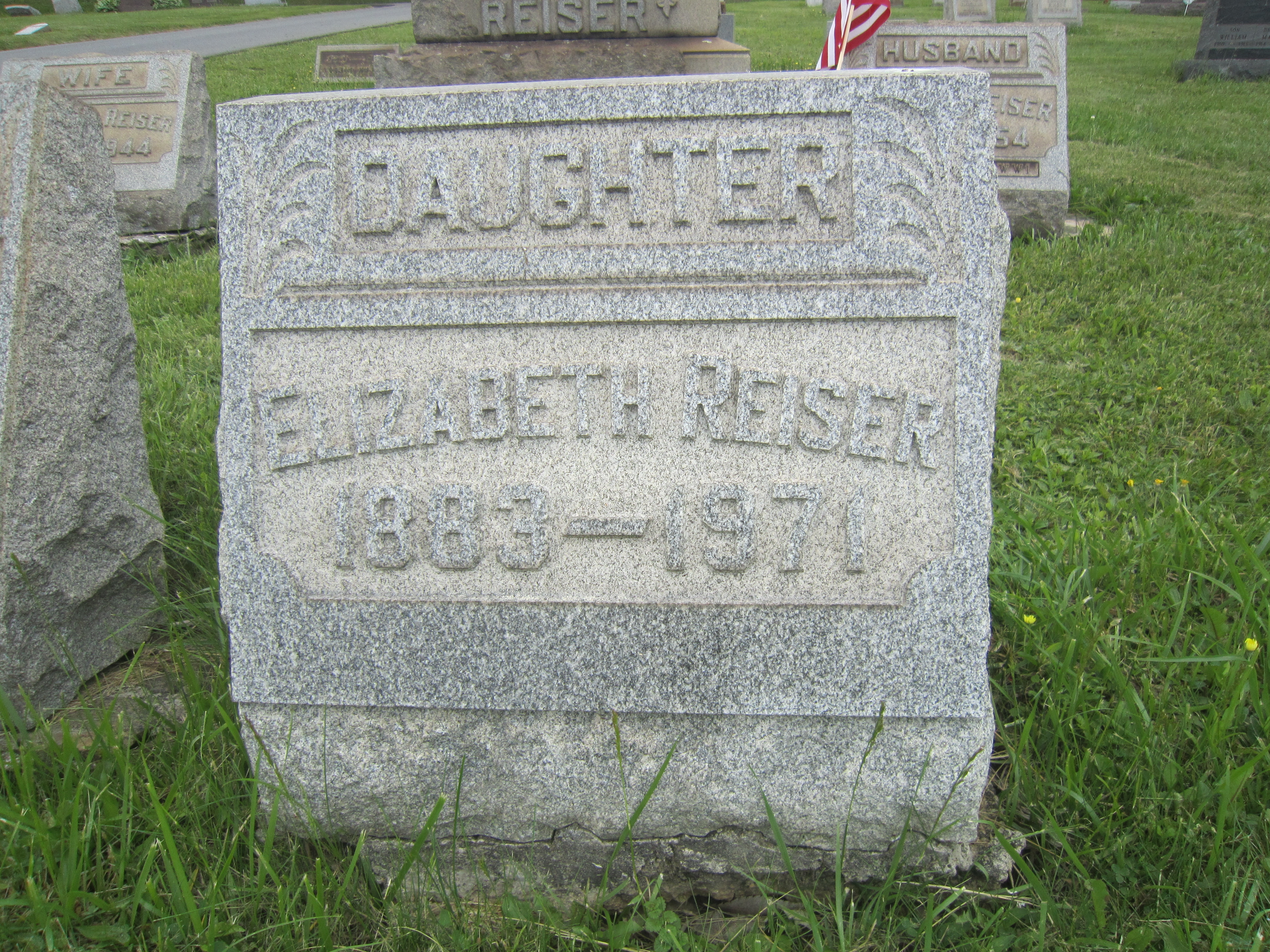 Elizabeth Reiser was born on April 18, 1883 in Johnstown, Cambria, Pennsylvania, USA. She died in April 1971, at age ~88, in Johnstown, Cambria, Pennsylvania, USA. She was buried in Saint Joseph Cemetery, Geistown, Pennsylvania.