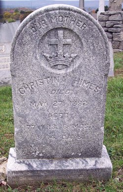 Peter Himes were married. She died on May 27, 1892, at age ~77, in Pennsylvania, USA. She was buried in Saint Joseph Cemetery, Geistown, Pennsylvania.