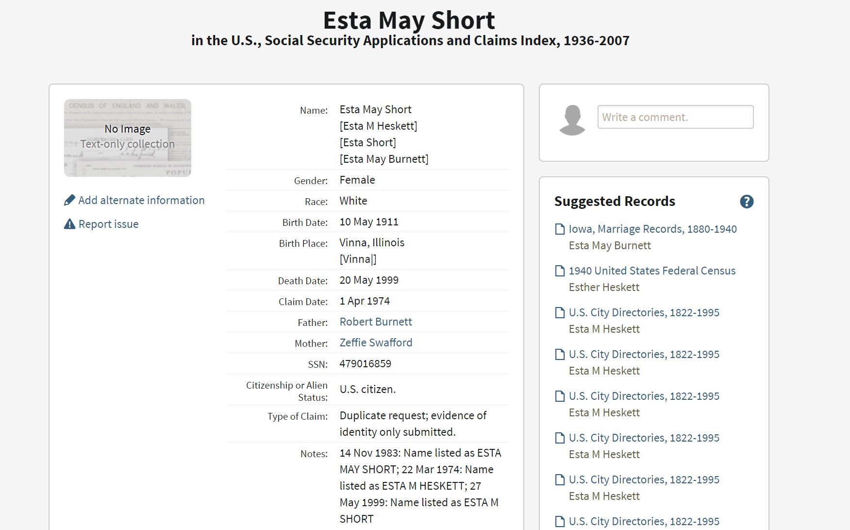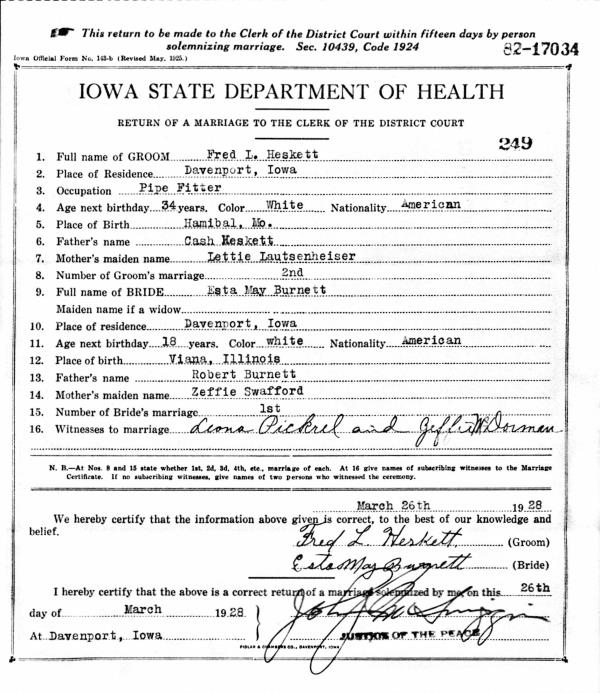 Fredrick Leon Heskett were married on March 26, 1928. She died on May 20, 1999, at age 88, in Davenport, Scott, Iowa, USA.
