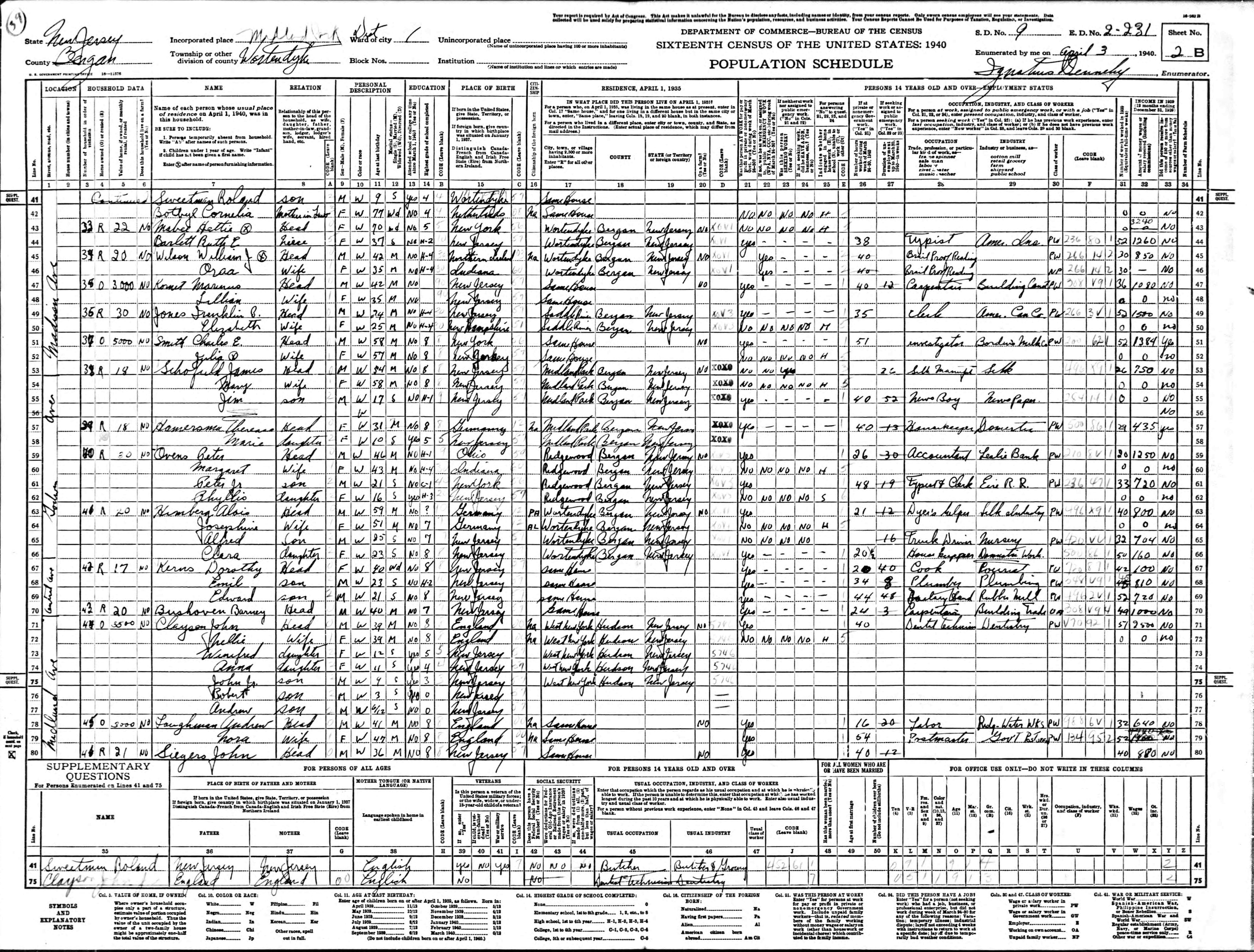 Ovens Family 1940 Federal Census New Jersey, Lines 59-62