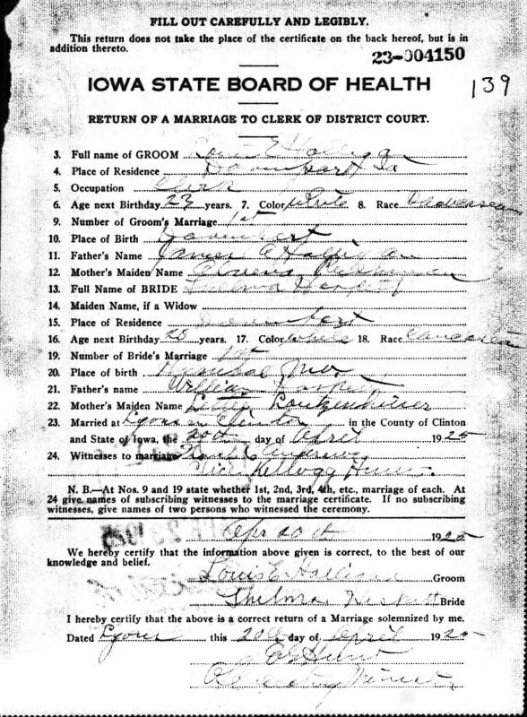 Thelma Margaret Heskett were married on April 20, 1925 in Lyons, Clinton, Iowa, USA. He died on March 17, 1946, at age 44, in Davenport, Scott, Iowa, USA. He was buried in Mount Calvary Catholic Cemetery, Davenport, Iowa.