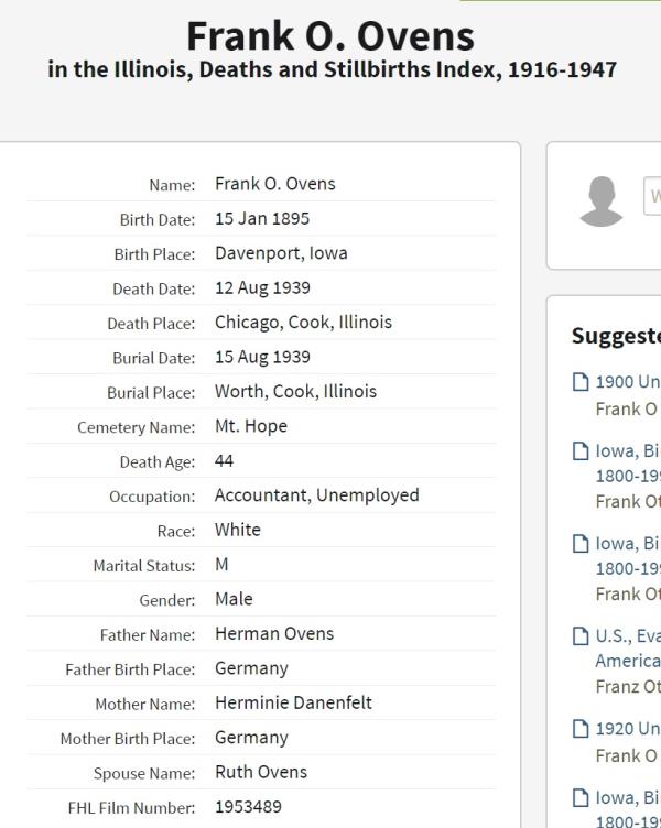 Frank Otto Ovens was born on January 15, 1895 in Davenport, Scott, Iowa, USA. He and