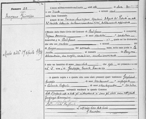 Giuseppe Fragano was born on March 8, 1929 in Perdifumo, Salerno, Campania, Italy. He died on April 17, 1929, at age 0, in Perdifumo, Salerno, Campania, Italy.