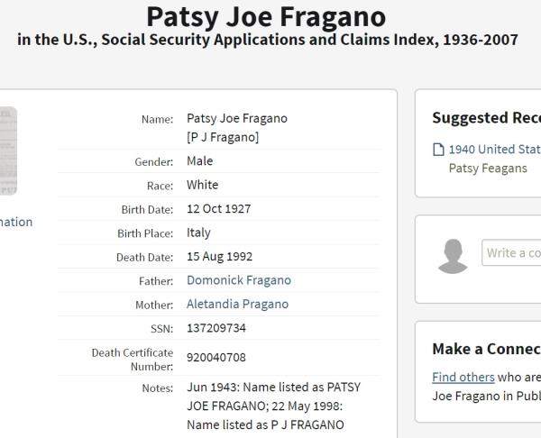 Pasquale Carmine Giuseppe "Patsy Joe" Fragano was born on October 12, 1927 in Perdifumo, Salerno, Campania, Italy. He and