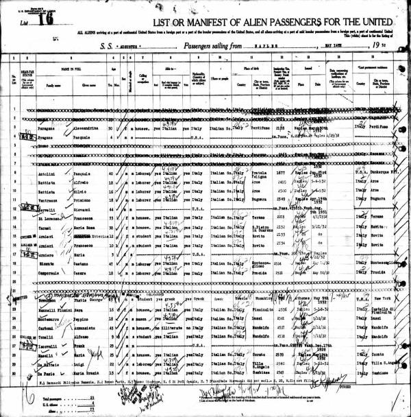 Fragano Family 1932 Ship Arrival Manifest, Lines 3-4