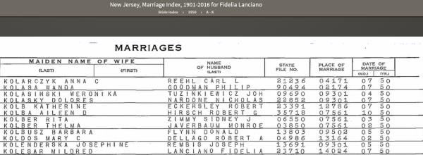 Fidelia John "Frederick" Lanciano were married in July 1950 in Boonton, Morris, New Jersey, USA. She died on March 1, 2018, at age 92, in Boonton, Morris, New Jersey, USA. She was buried in Rosedale Cemetery, Orange, New Jersey.