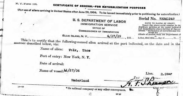 Thomas Volk 1906 Ship Departure Manifest, Line 9