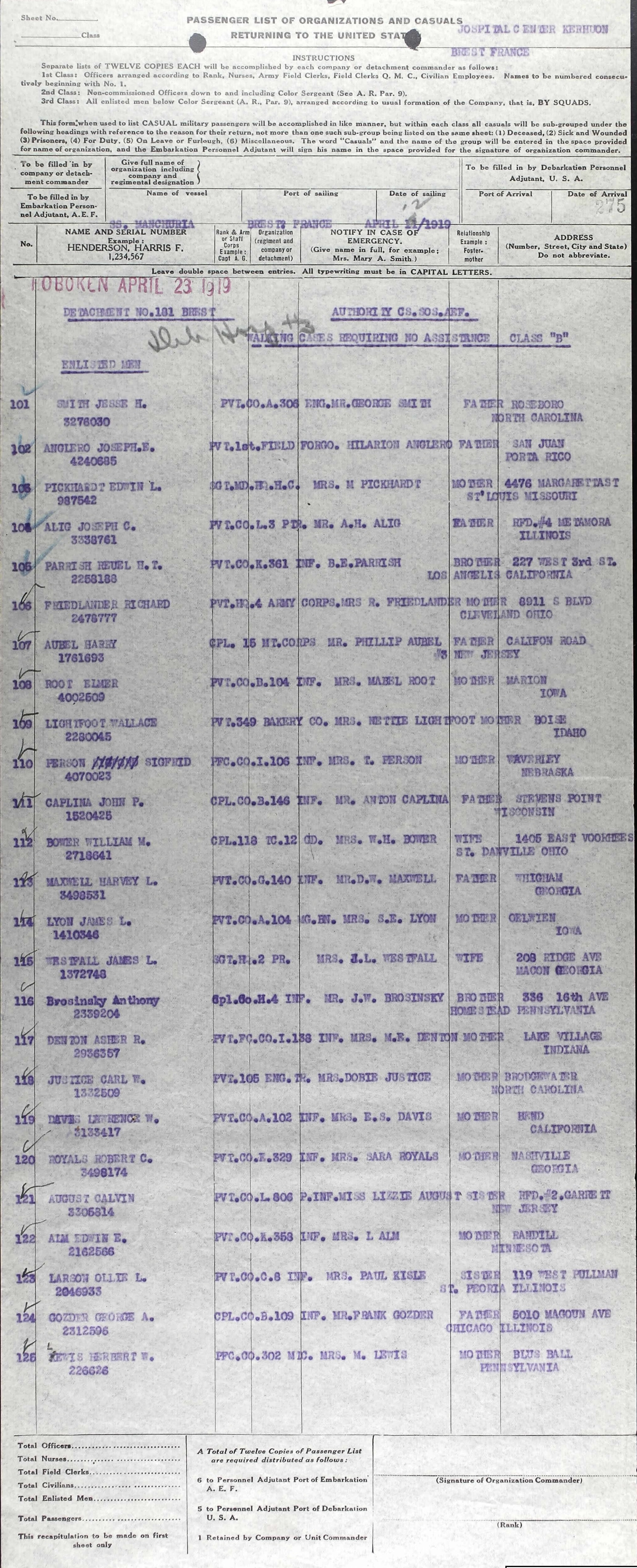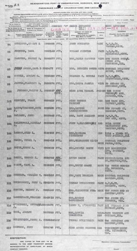Ollie Larson 1918 Army Ship Departure Manifest, Line 105