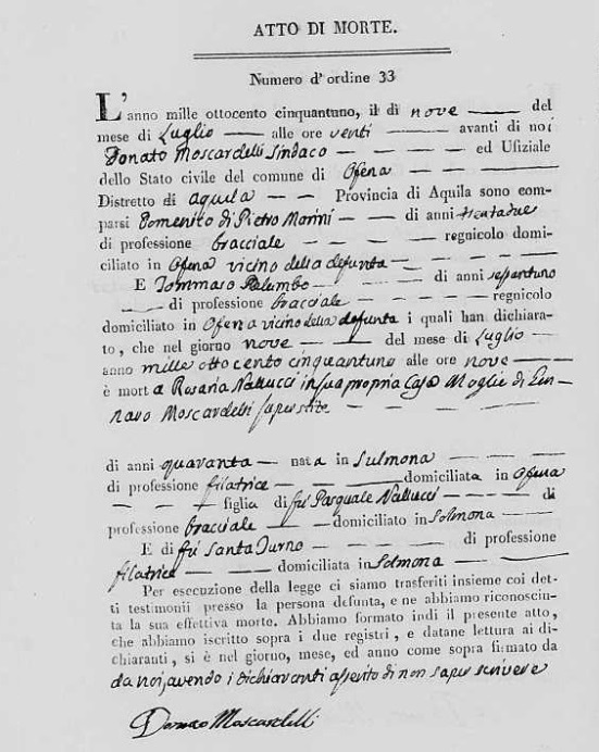Gennaro Antonio Moscardelli were married on March 4, 1826 in Solmona, L'Aquila, Abruzzo, Italy. She died on July 9, 1851, at age 43, in Ofena, L'Aquila, Abruzzo, Italy.