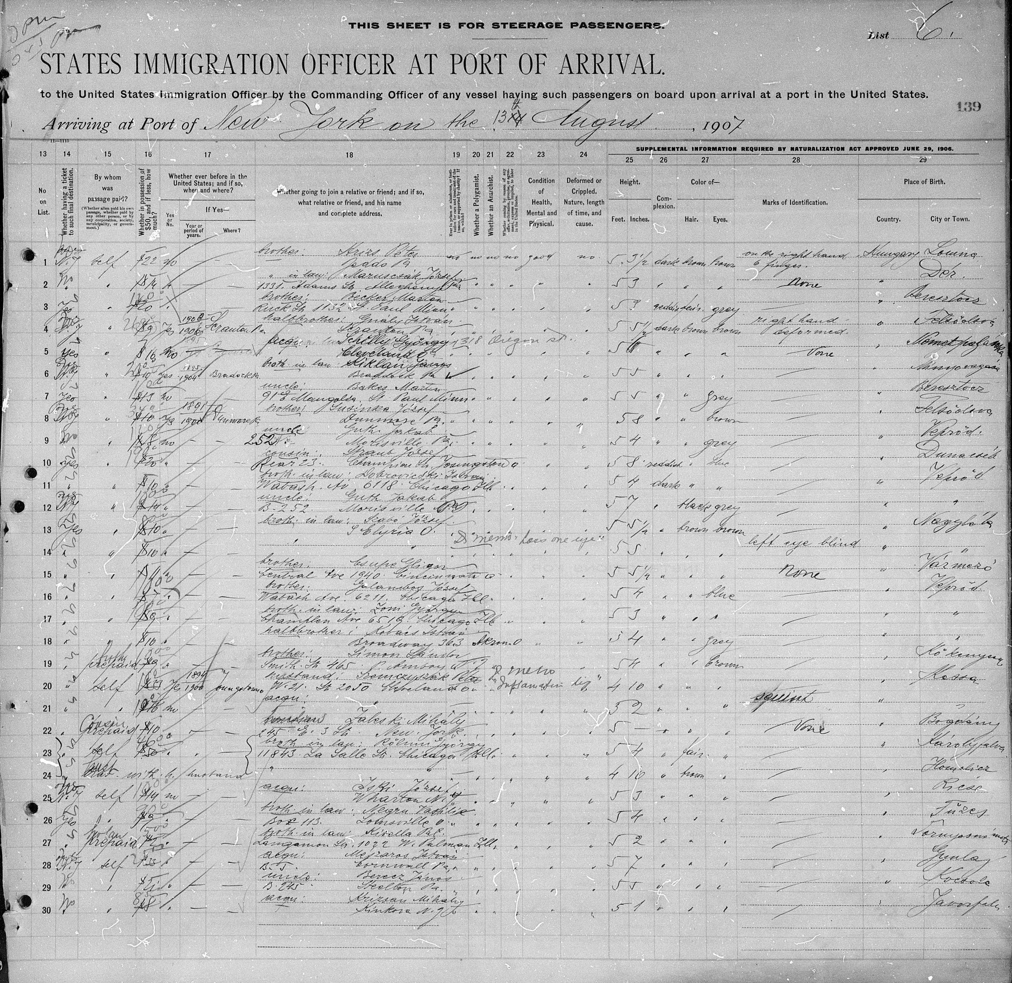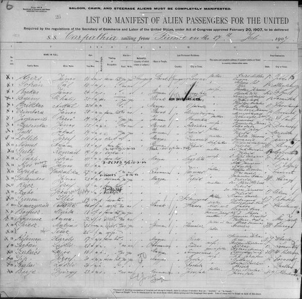 Lajos Szakacs 1907 Ship Arrival Manifest, Line 27