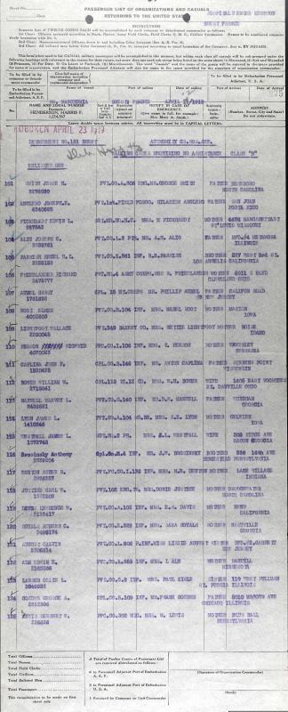 Ollie Larson 1919 Army Ship Departure Manifest, Line 123