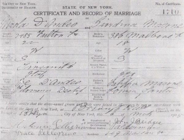 Nicolangelo D'Andrea were married on March 6, 1905 in Brooklyn, Kings, New York, USA. She died.