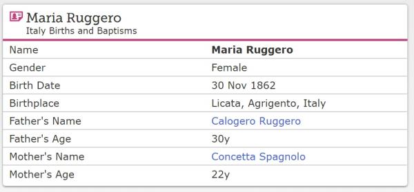 Maria Ruggerio was born on November 30, 1862 in Licata, Agrigento, Sicily, Italy. She died.