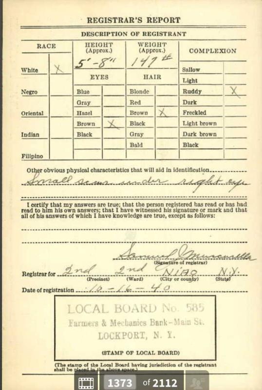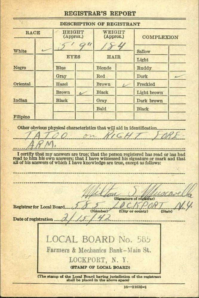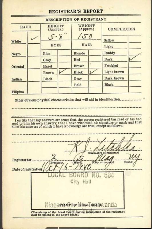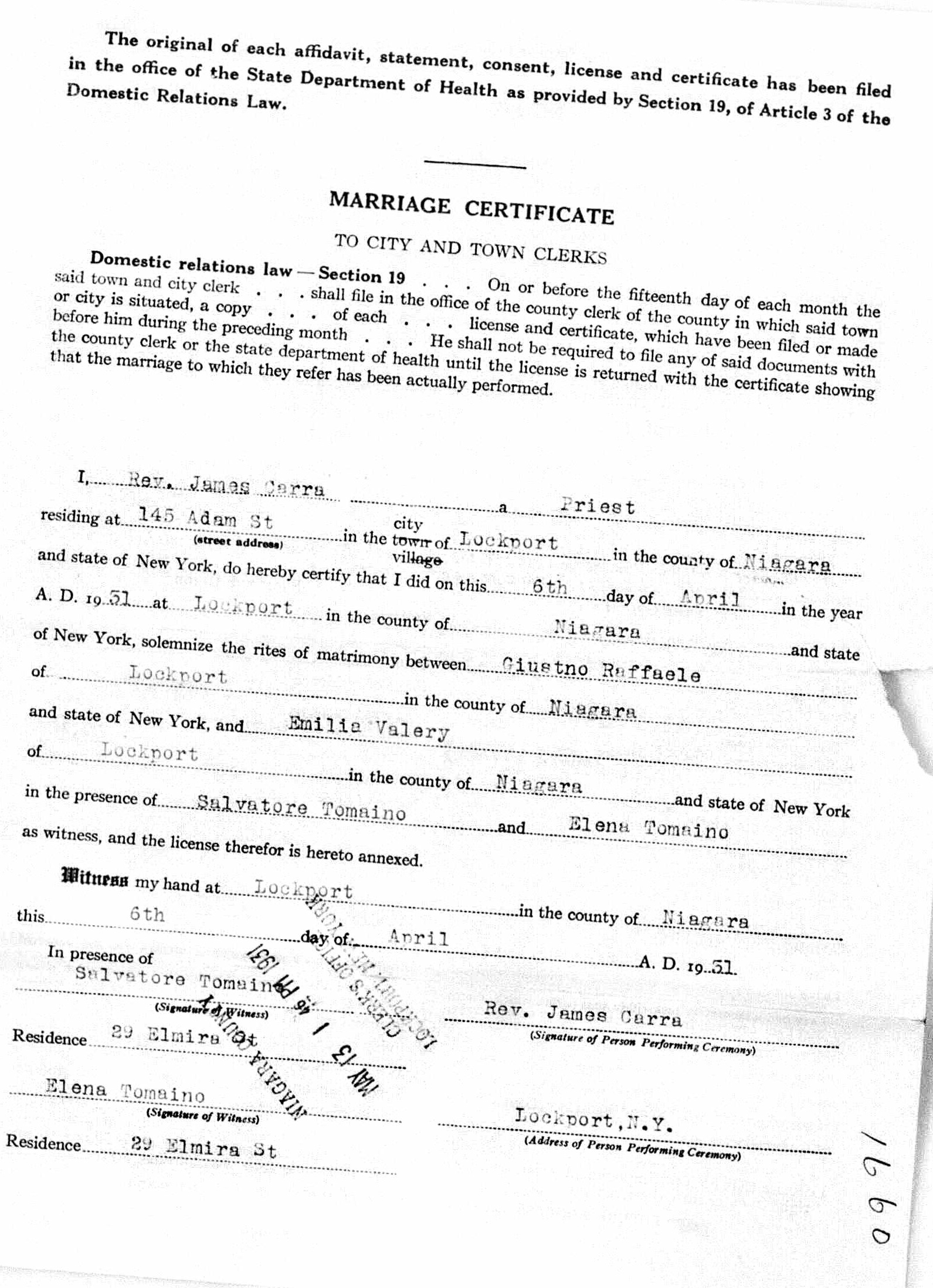 Rosa Amelia Valeri were married on November 4, 1939 in Lockport, Niagara, New York, USA. He died in July 1987, at age 78, in North Tonawanda, Niagara, New York, USA. He was buried in Mount Olivet Cemetery, Kenmore, New York.