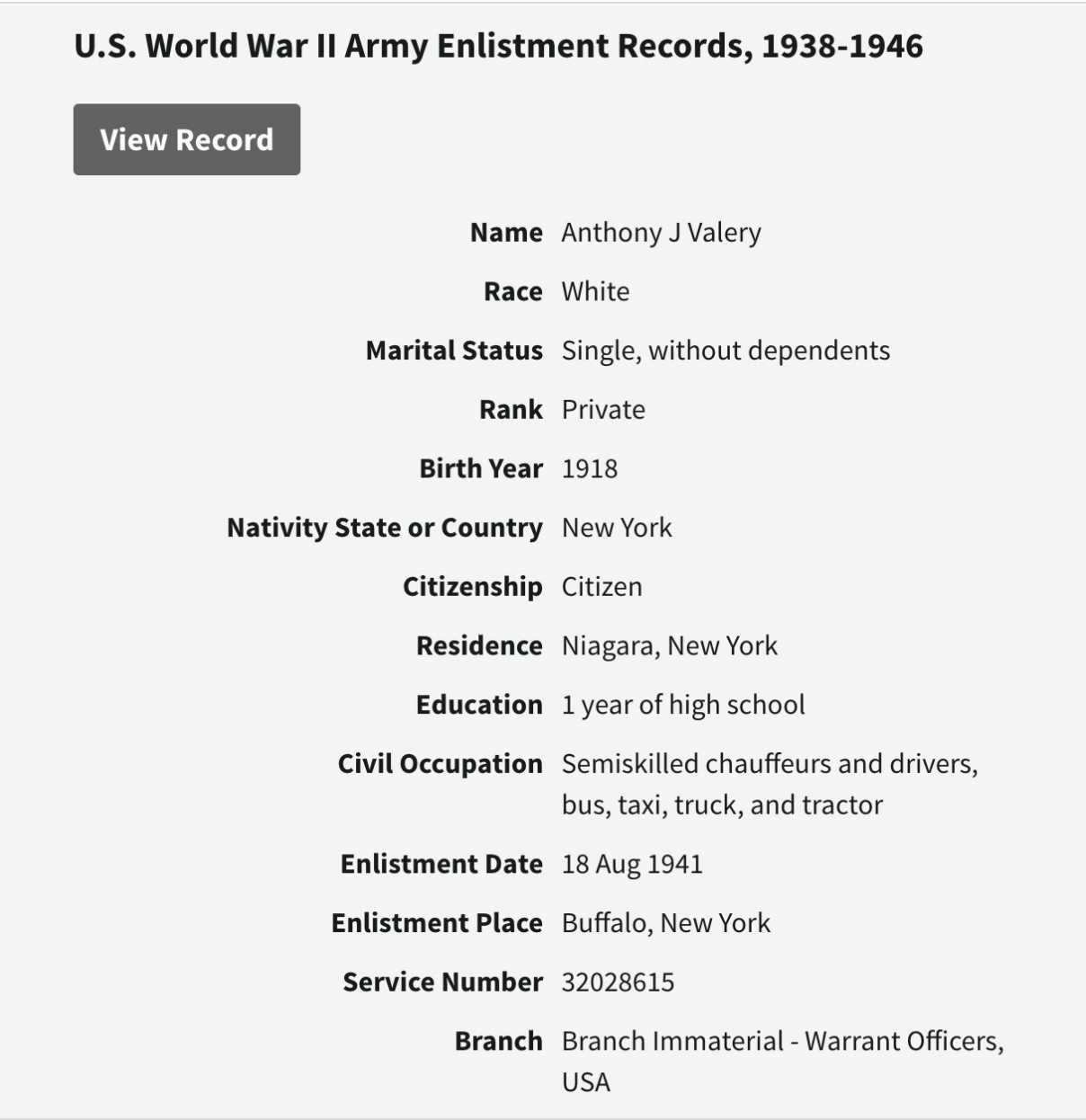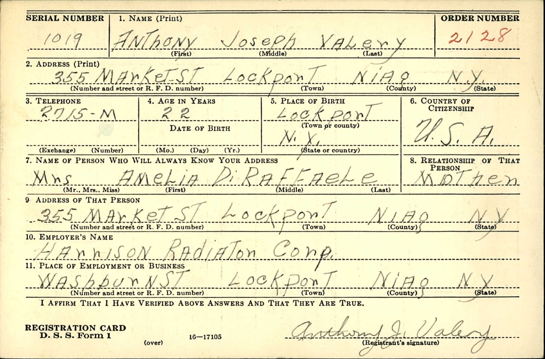 Anthony J. Valeri was born on February 7, 1918 in Lockport, Niagara, New York, USA. He and