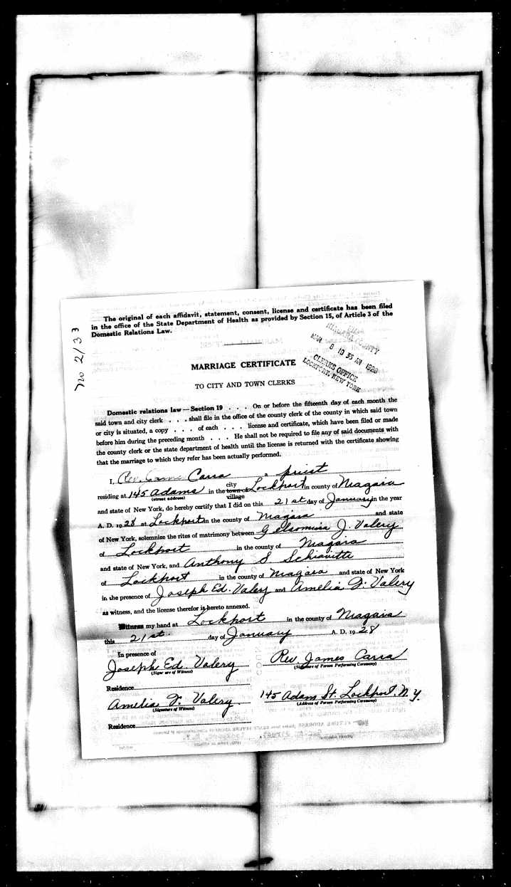 Jessamina J. Valeri were married on January 21, 1928 in Lockport, Niagara, New York, USA. He died on February 23, 1963, at age 57, in Lockport, Niagara, New York, USA. He was buried in Saint Patrick's Cemetery, Lockport, New York.