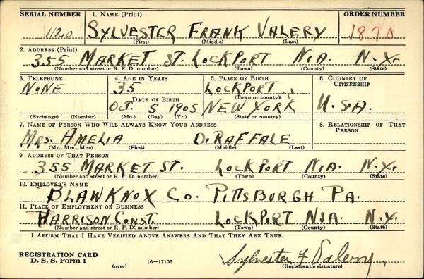 Silvester Frank Valeri was born on October 5, 1905 in Lockport, Niagara, New York, USA. He died in 1978, at age ~73. He was buried in Cold Springs Cemetery, Lockport, New York.