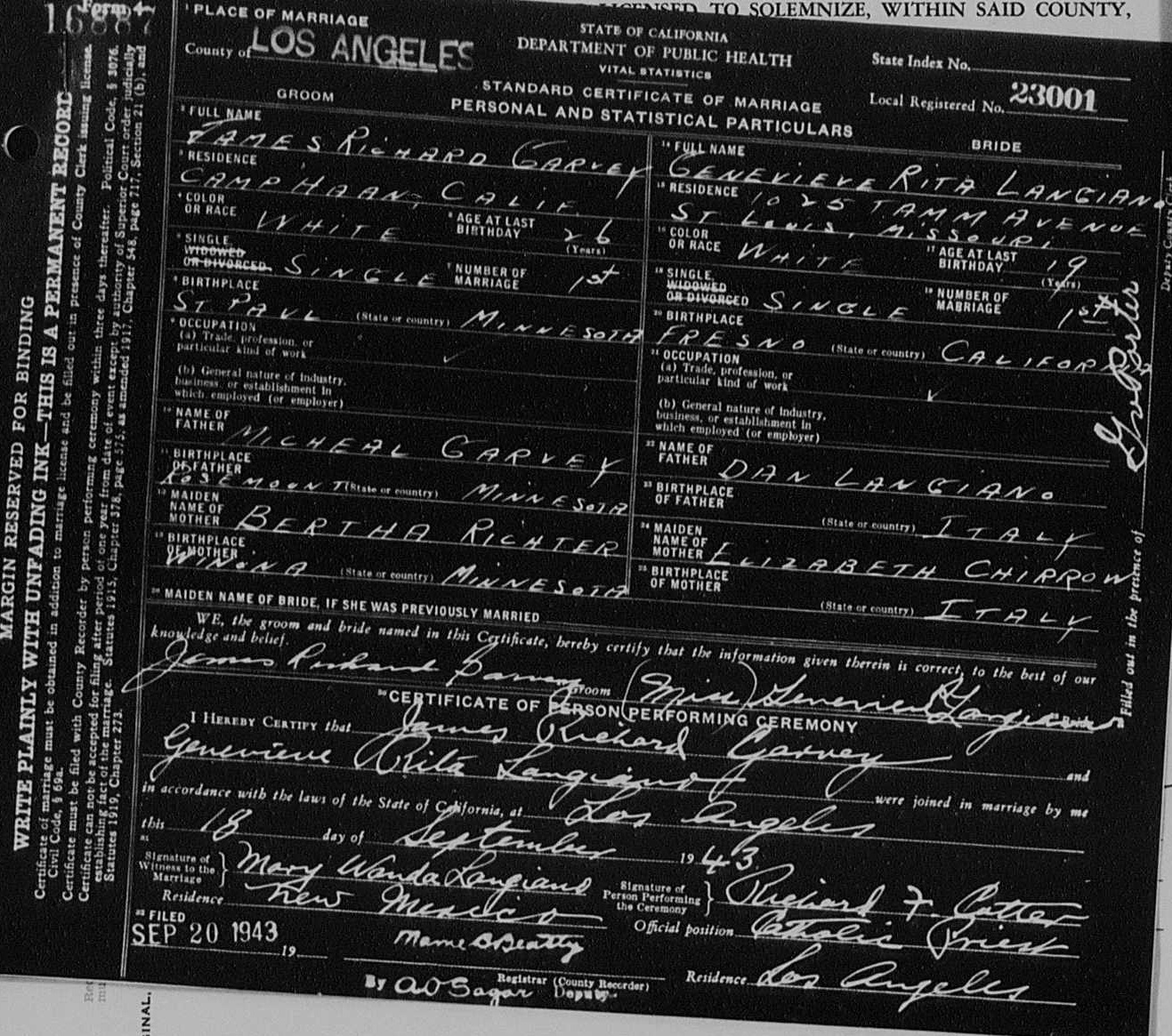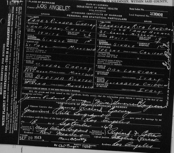 Genevive Rita "Jennie" Langiano were married on September 20, 1943 in Los Angeles, California, USA. He died.