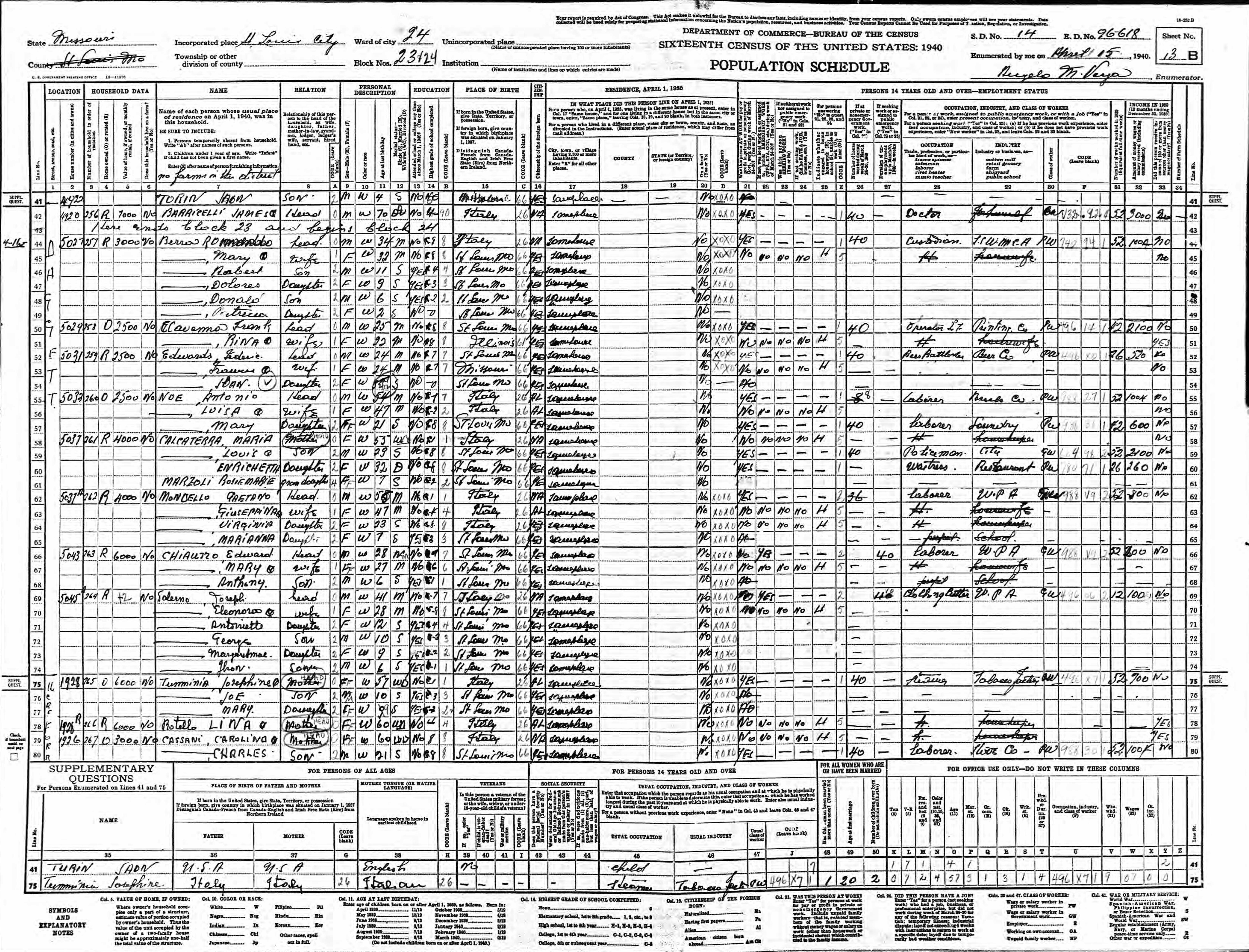 Ciaurro Family 1940 Federal Census Missouri, Lines 66-68