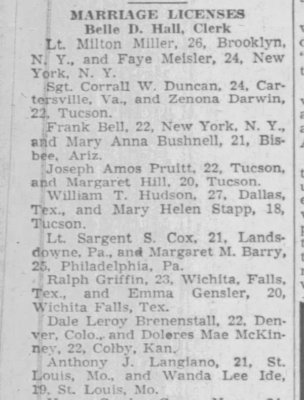 Wanda Lee Ide were married on January 9, 1943 in Tuscon, Pima, Arizona, USA. He and