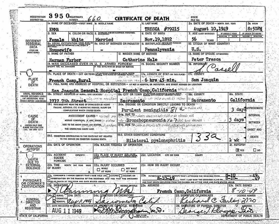 Pietro Vincenzo Donato Tresca were married. She died on August 10, 1949, at age 56, in Sacramento, Sacramento, California, USA. She was buried in Old Fellows Lawn Cemetery, Sacarmento, California.