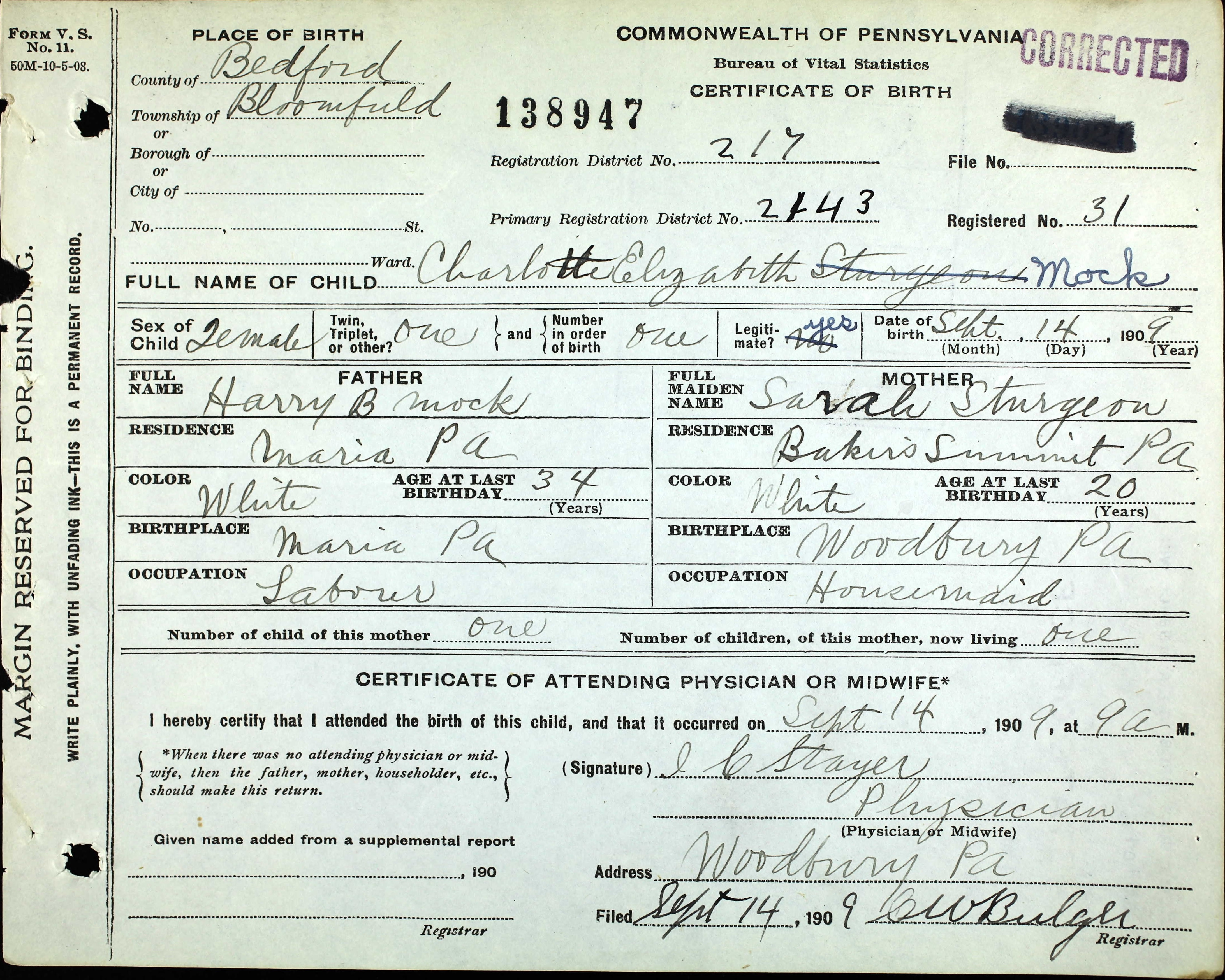 Charlotte Elizabeth Mock was born on September 14, 1909 in Bakers Summit, Bedford, Pennsylvania, USA. She and