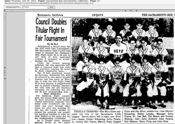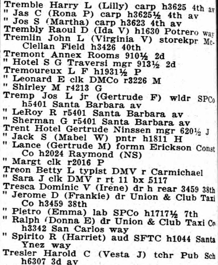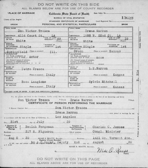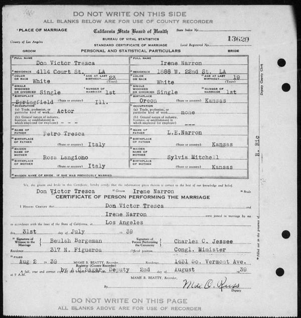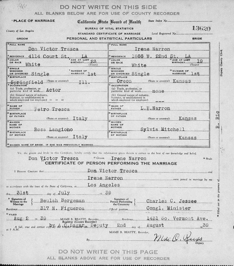 Dominic Victor Tresca were married on August 2, 1939 in Los Angeles, Los Angeles, California, USA. She died on March 24, 1999, at age 79, in Sacramento, Sacramento, California, USA. She was buried in Old Fellows Lawn Cemetery, Sacarmento, California.