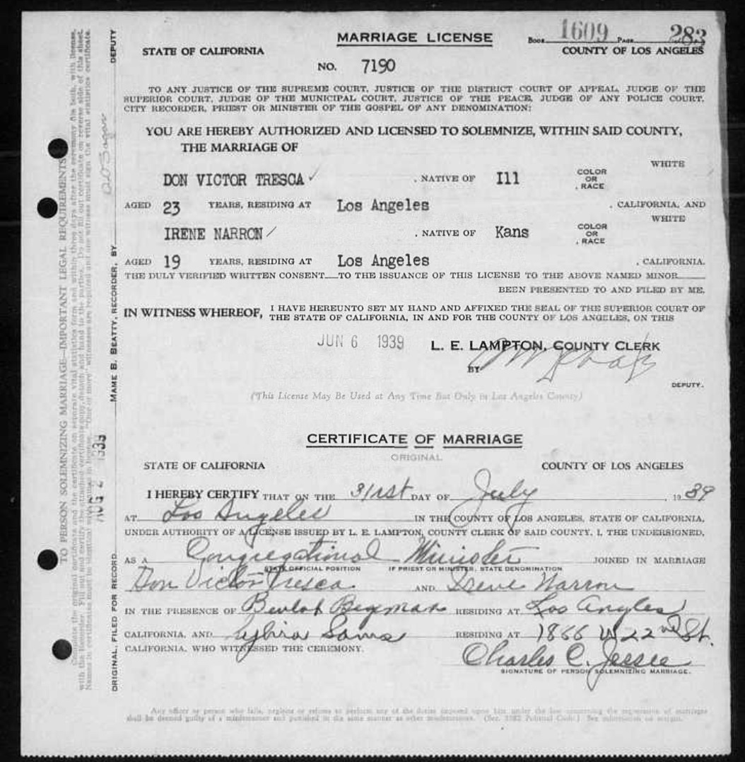 Girolamo "Jerry" Dominic Tresca, Sr., were married on September 9, 1943 in Reno, Washoe, Nevada, USA.