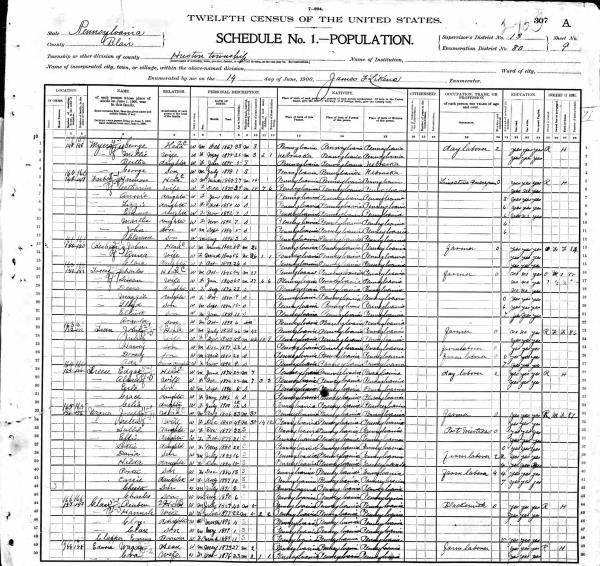 Mock Family 1910 Federal Census Pennsylvania, Lines 3-5