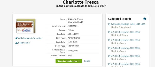 Pietro Vincenzo Donato Tresca were married on September 16, 1950 in Sacramento, Sacramento, California, USA. She died on January 5, 1985, at age 75, in Sacramento, Sacramento, California, USA.